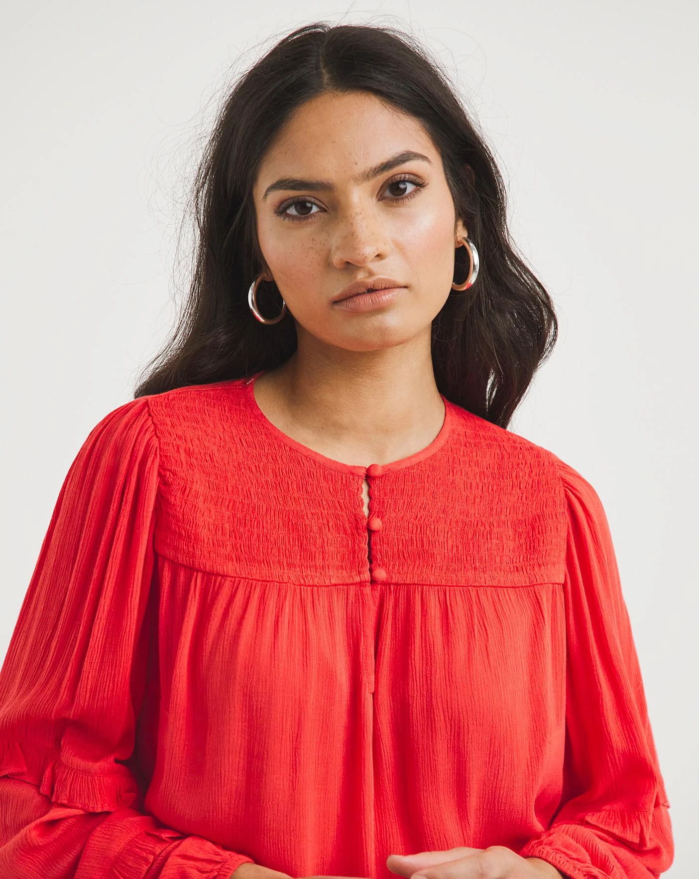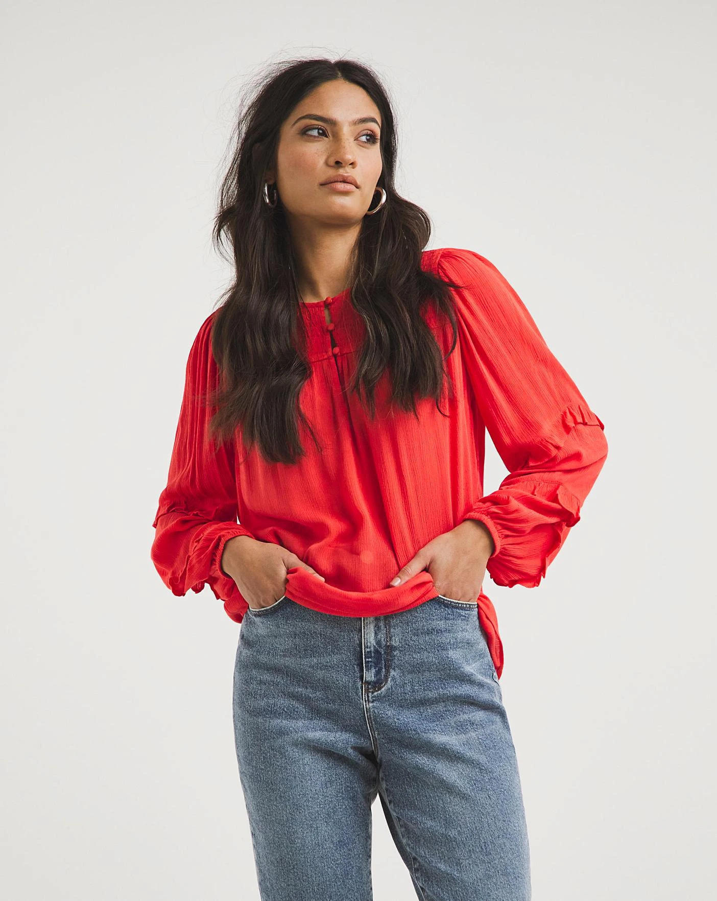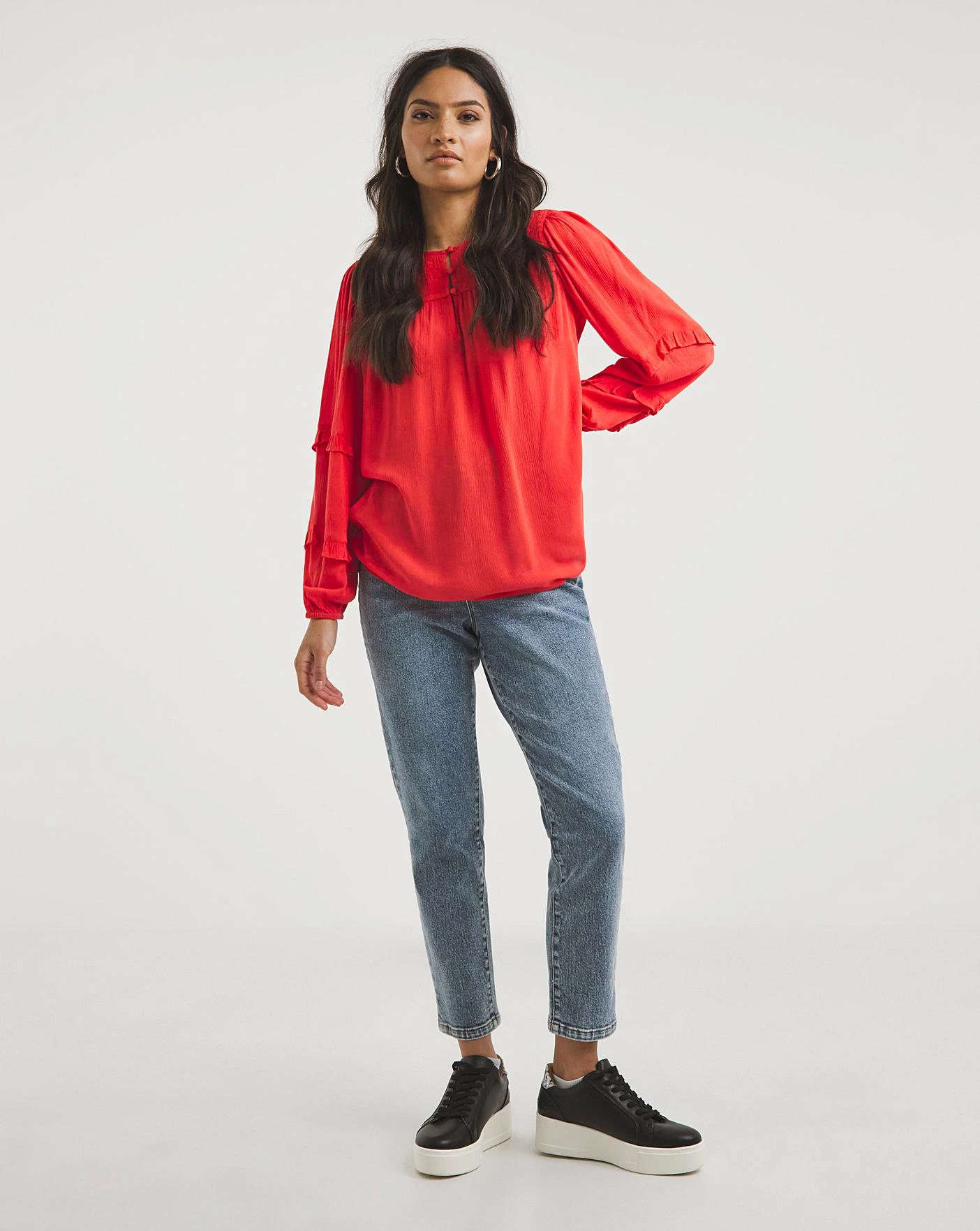 For the perfect seasonal daytime look, choose our shirred yoke top featuring flattering frilled sleeves. Pair this top easily with jeans, and style it tucked in or out to complete the look. Please note that this top is made of a non-stretch fabric and comes in a relaxed fit.