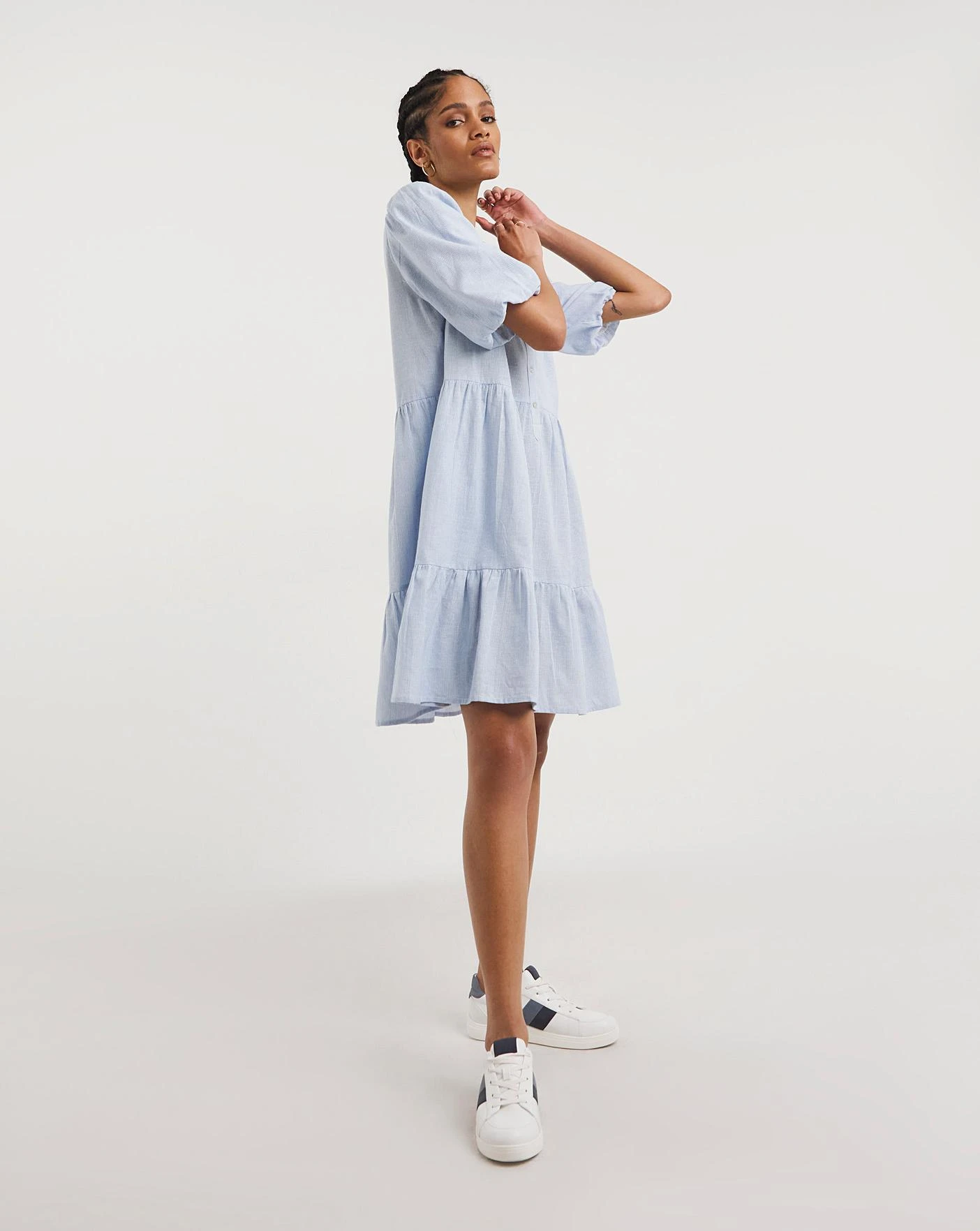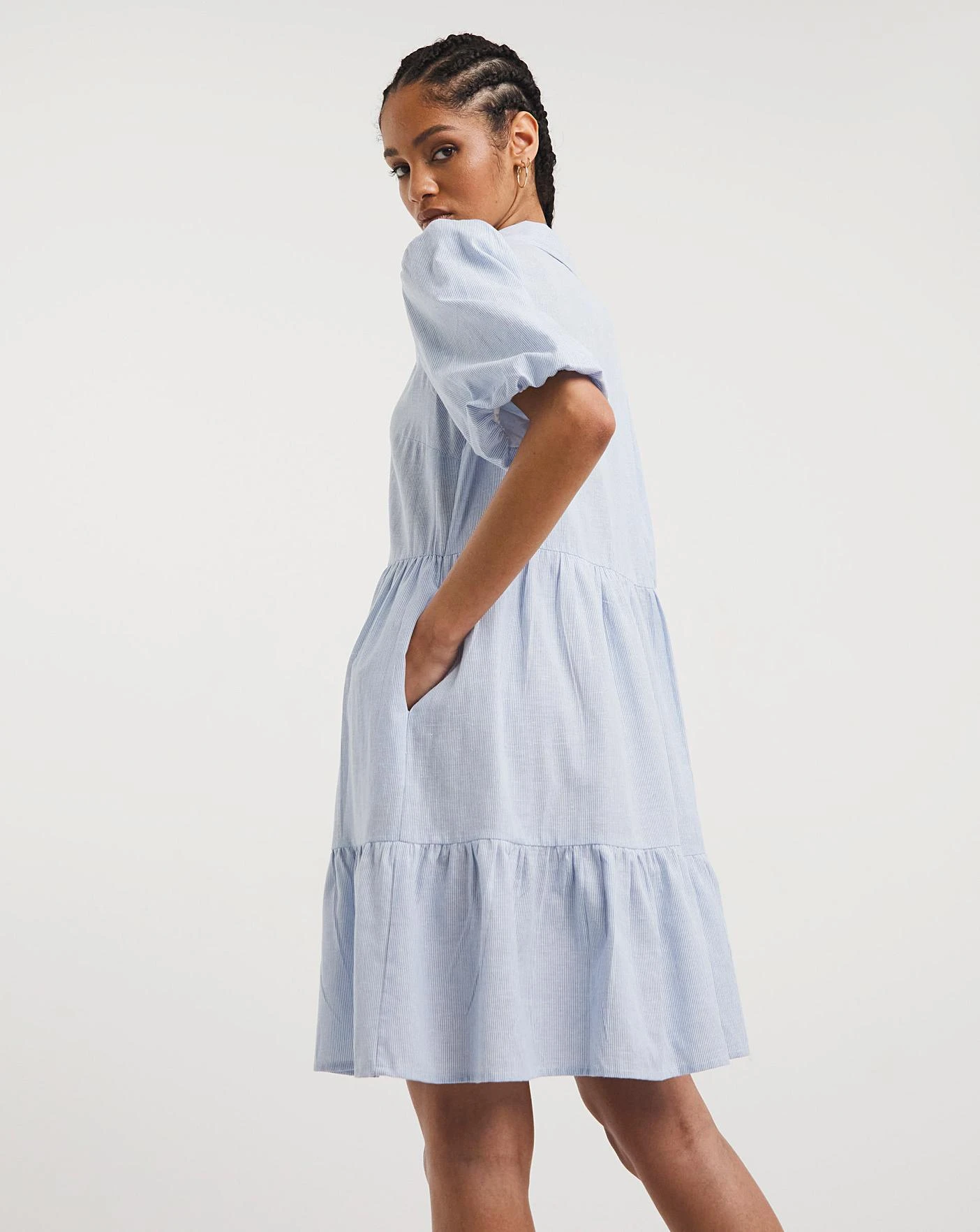 In a sustainable Viscose fabric, this is gorgeous piece to add to you wardrobe. Designed with a shirred bodice to give a flattering shape and short puff sleeves with deep elasticated cuffs, falling to our midi length. This style can be dressed up with a pair of trainers or sandals, perfect for summer.