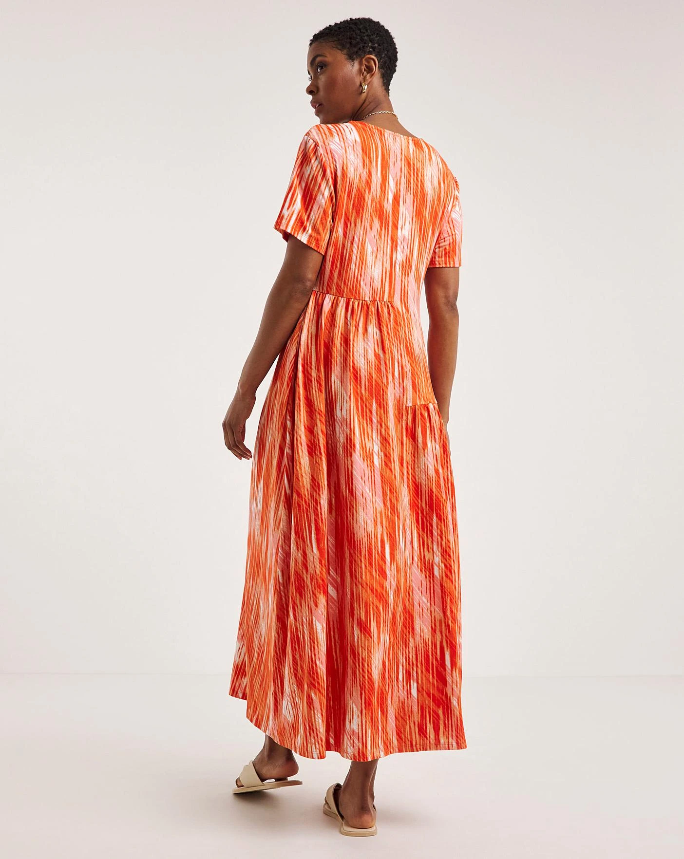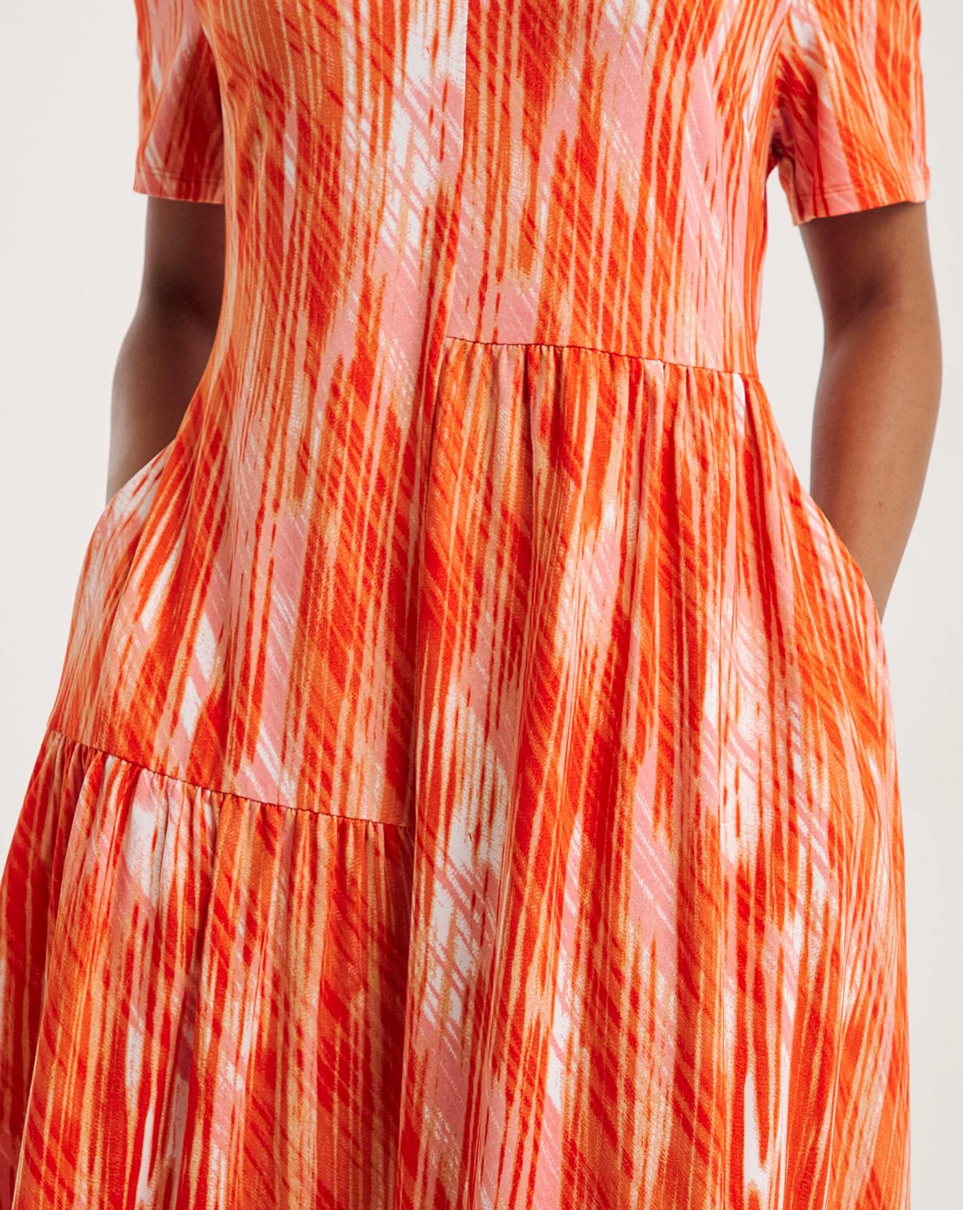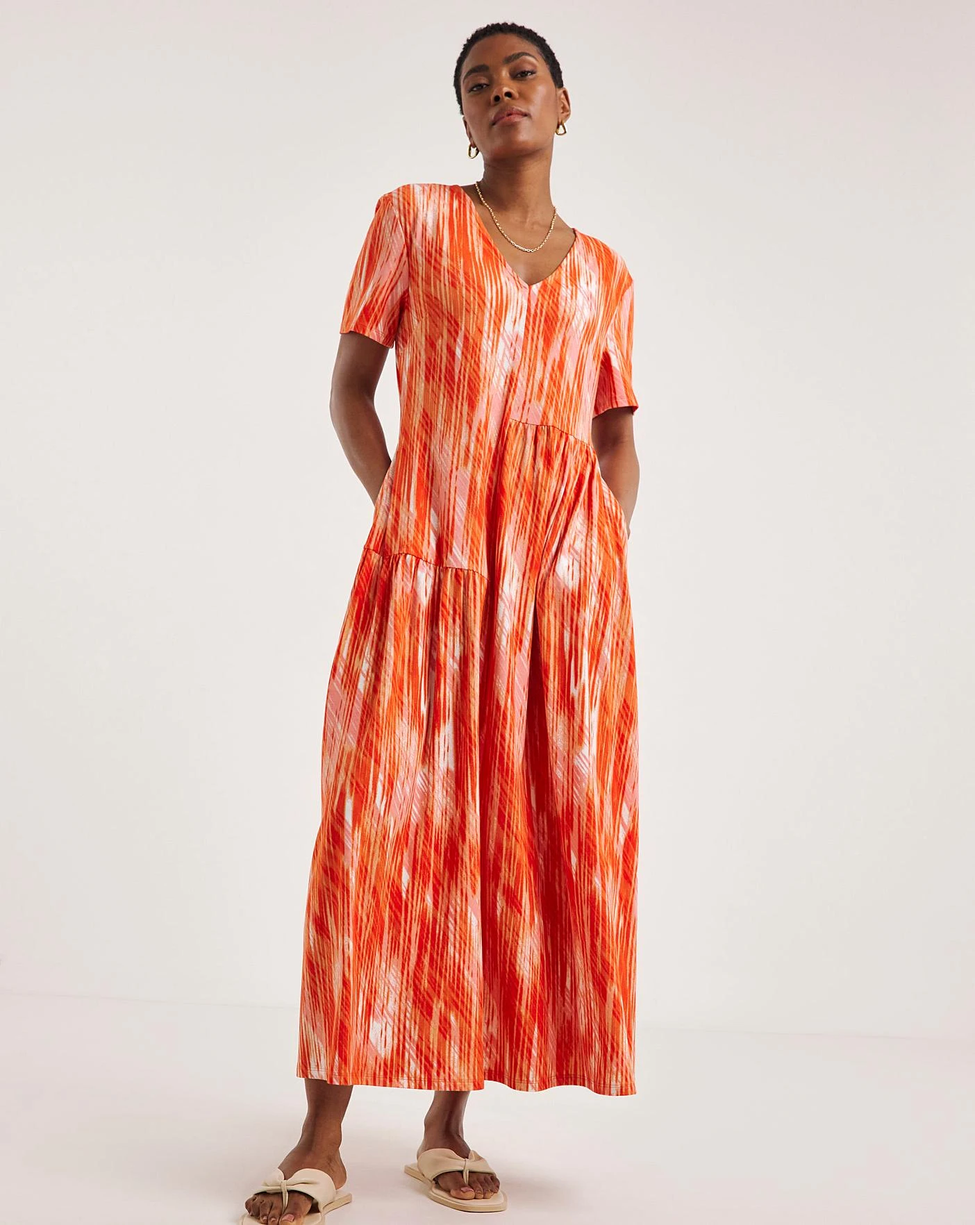 This pretty soft touch asymmetric dress is perfect for the sunshine. In a relaxed, loose shape, this dress features a midi length, short sleeves and V-neckline.