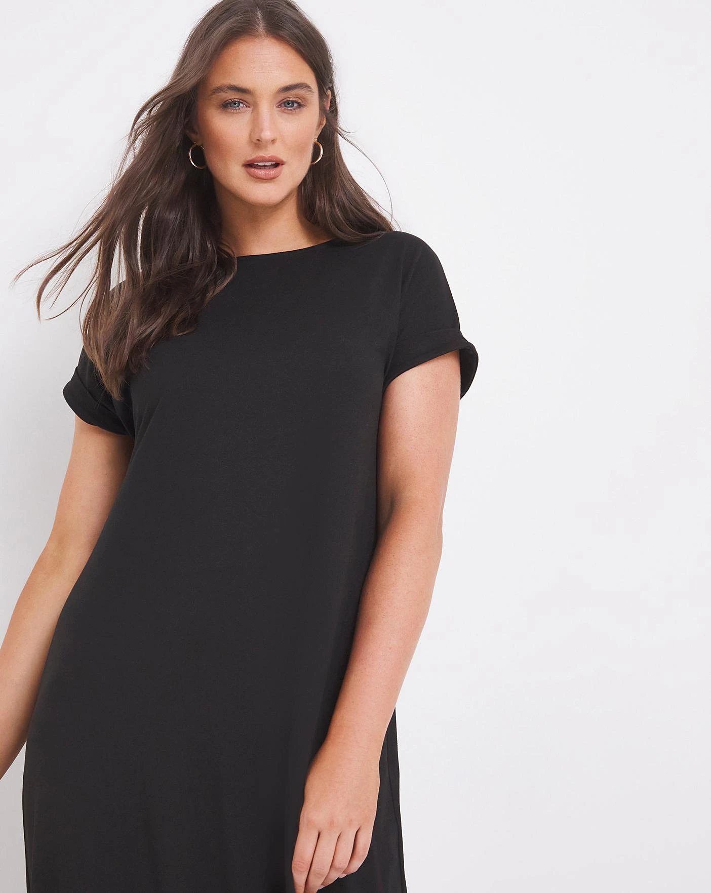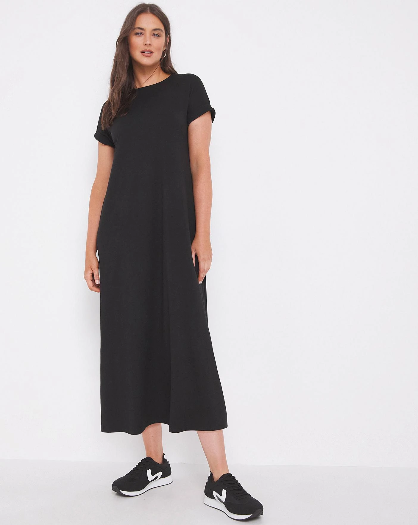 Our bestselling swing shape now available in a midaxi length. Crafted from a premium soft touch jersey fabrication, this dress hangs beautifully when worn. Featuring grown on sleeves with a turn-up detail, a round crew neck, and falling to 48inches. In a regular fit a-line shape, we suggest taking your normal size.