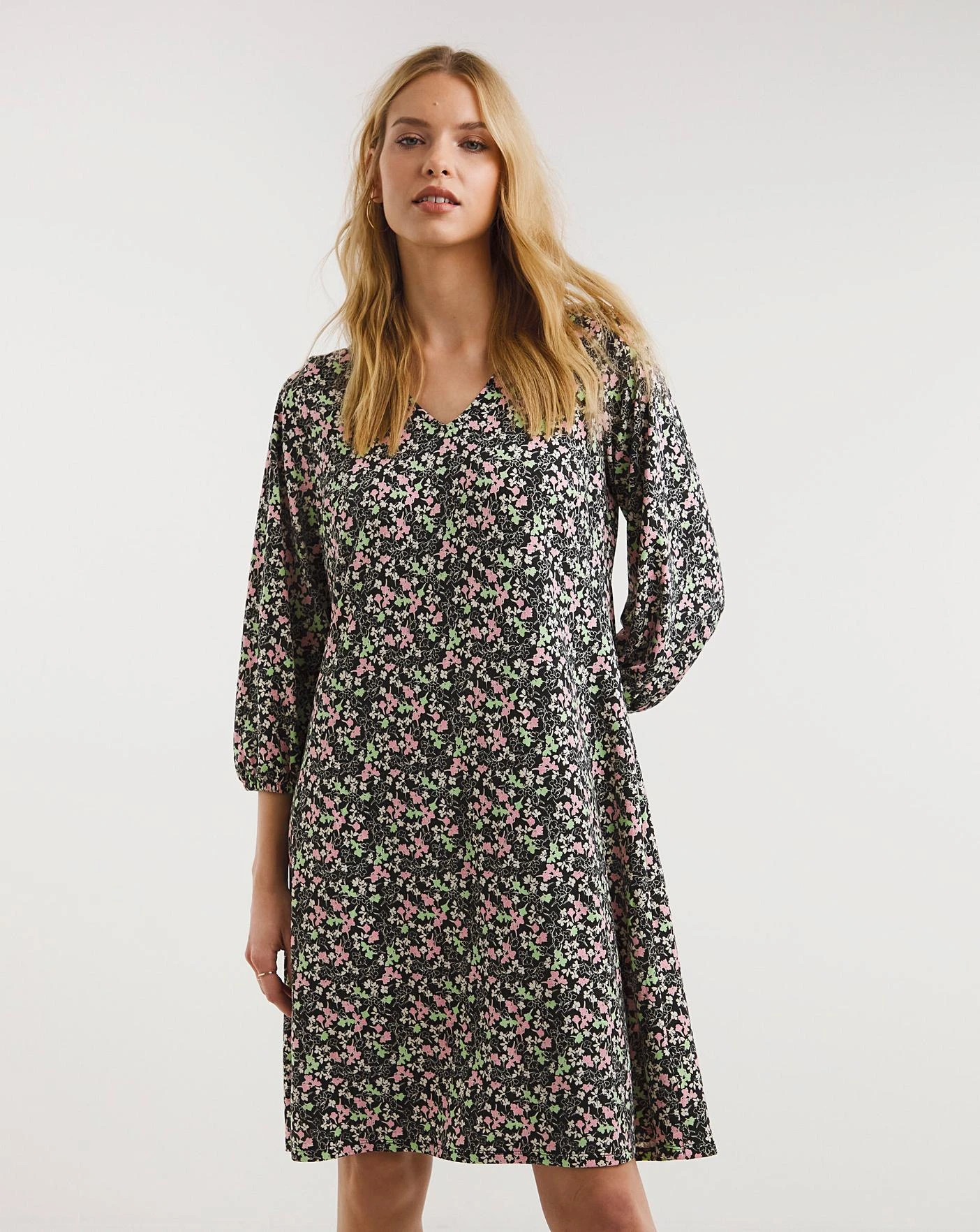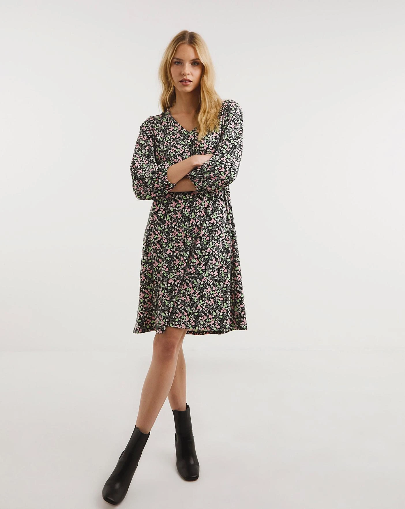 You will love the super soft feel of our best-selling Soft Touch Jersey fabric, consciously sourced from re-cycled materials. Featuring three quarter length sleeves and an elegant v-neckline. Designed in a flattering A-line swing shape this easy versatile dress is a customer favourite and will be your go to throw on, perfect for everyday styling.