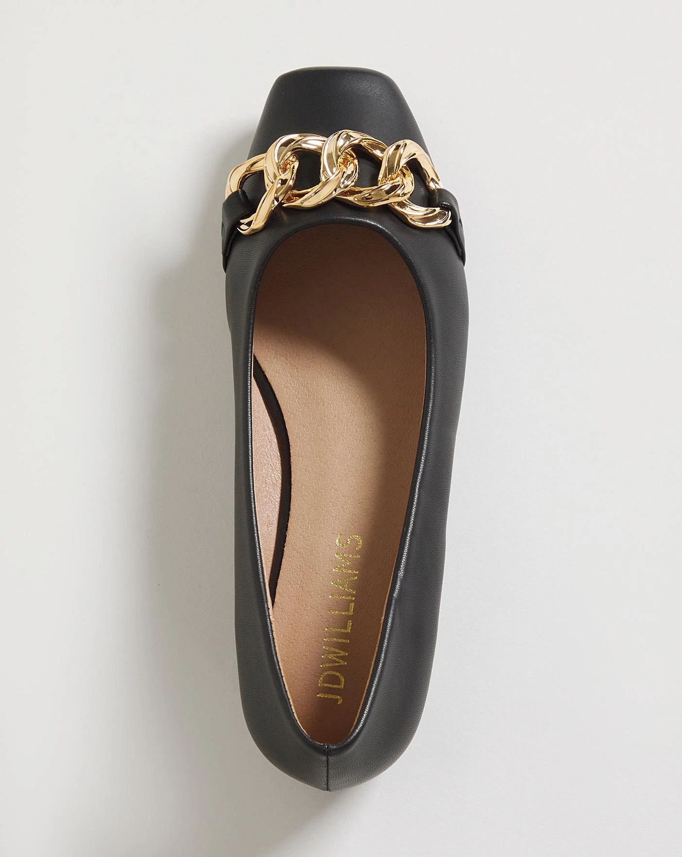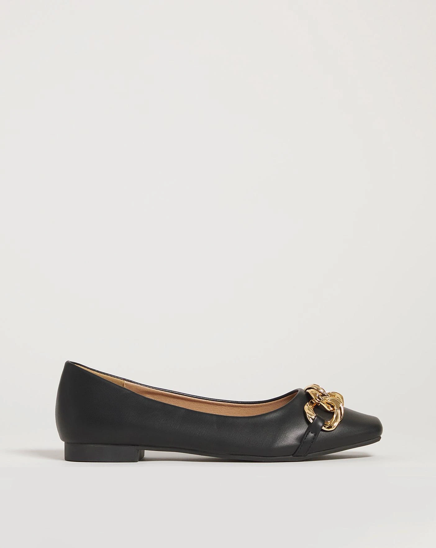 These square toe ballerina flats feature a chunky chain hardware detail, soft faux leather upper and flexi sole.