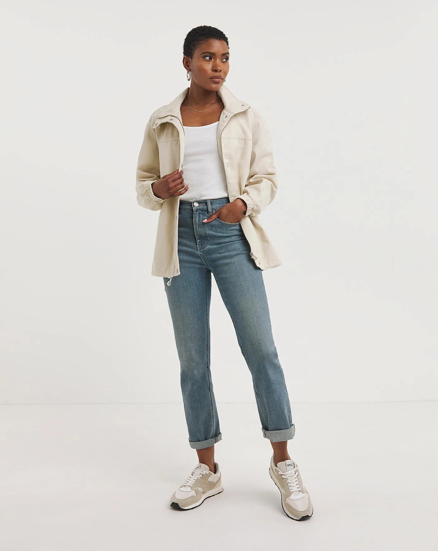 This relaxed utility jacket is the perfect lightweight jacket this summer. Featuring a stand collar, elasticated cuffs and a drawstring waist for adjustability.