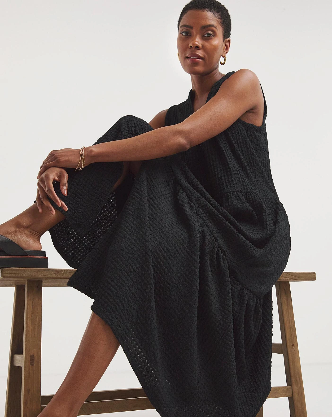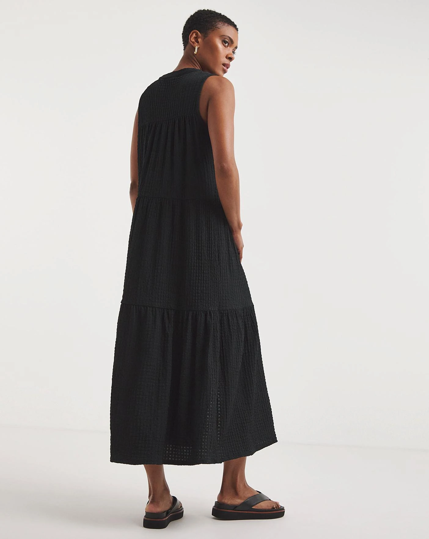 Perfect for the upcoming sun! This new textured jersey smock dress features a pretty tiered full hem and tie neck detail. Style with sandals this season for a beautiful summer look. In a midi length, this smock shape is truly flattering.