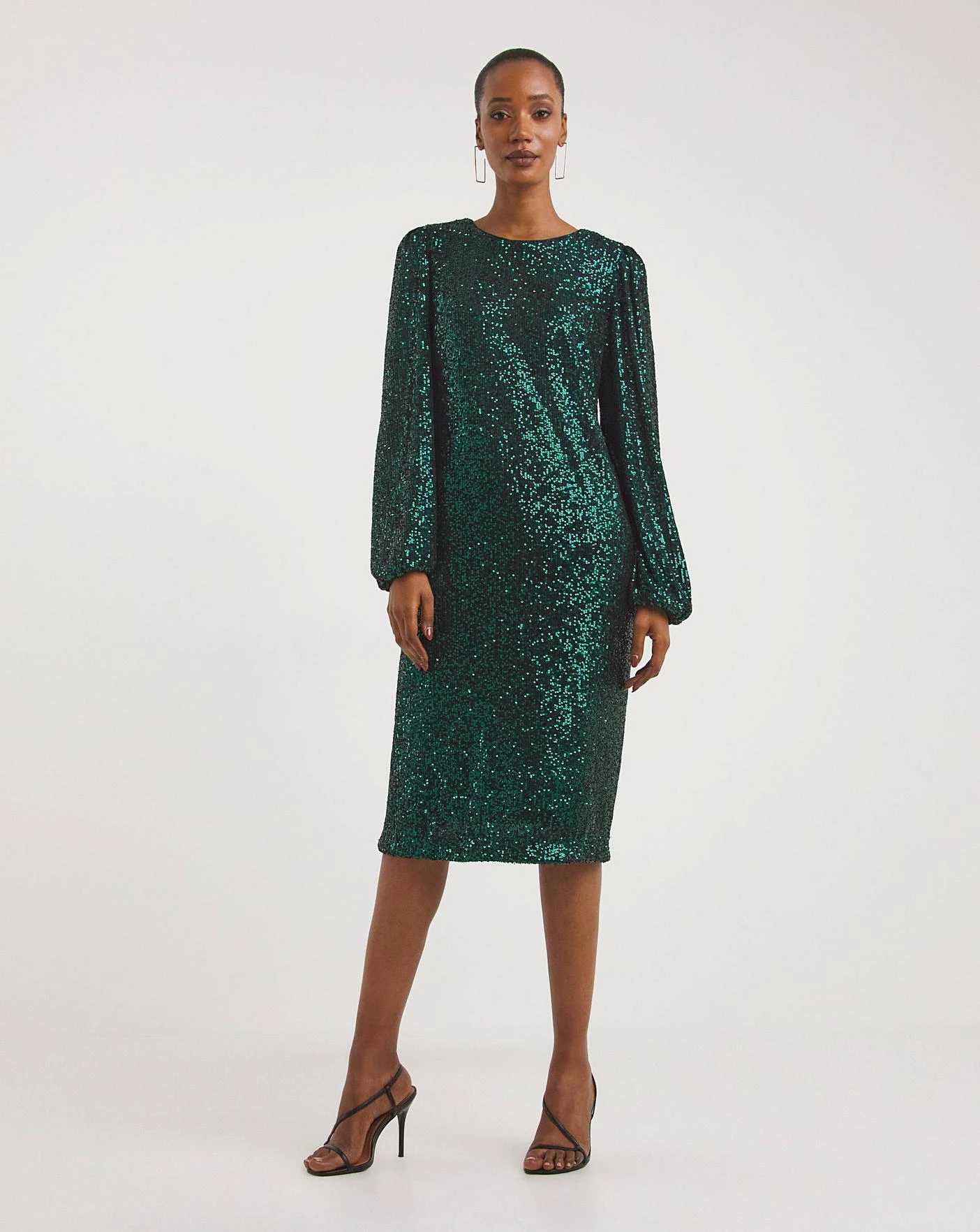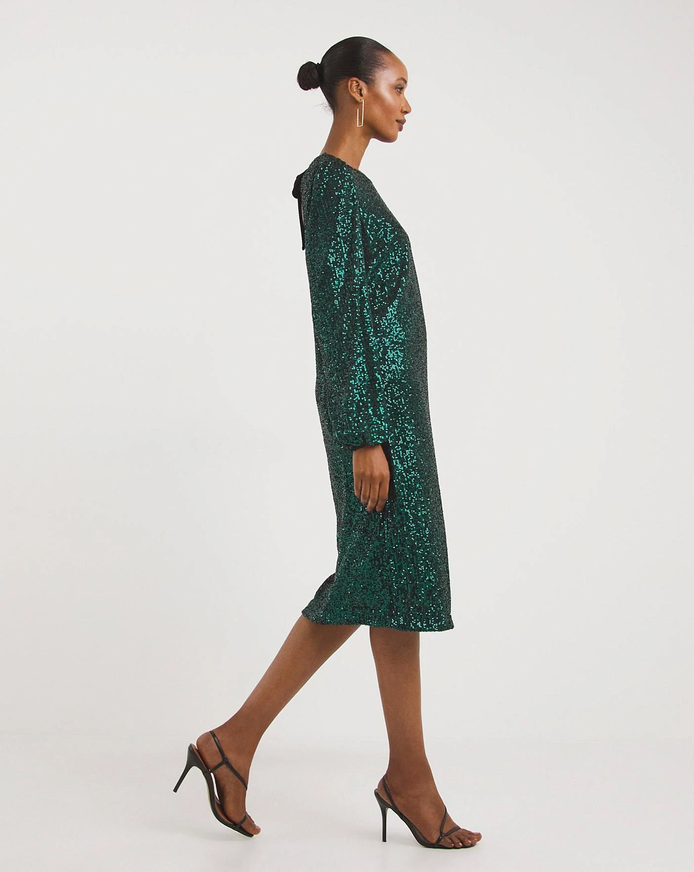 Be the topic of conversation in this gorgeous emerald green sequin dress. Featuring a beautiful velvet tie back neckline and long elasticated cuff sleeves. This all over sequin dress is fully lined to ensure comfort while you dance the night away.