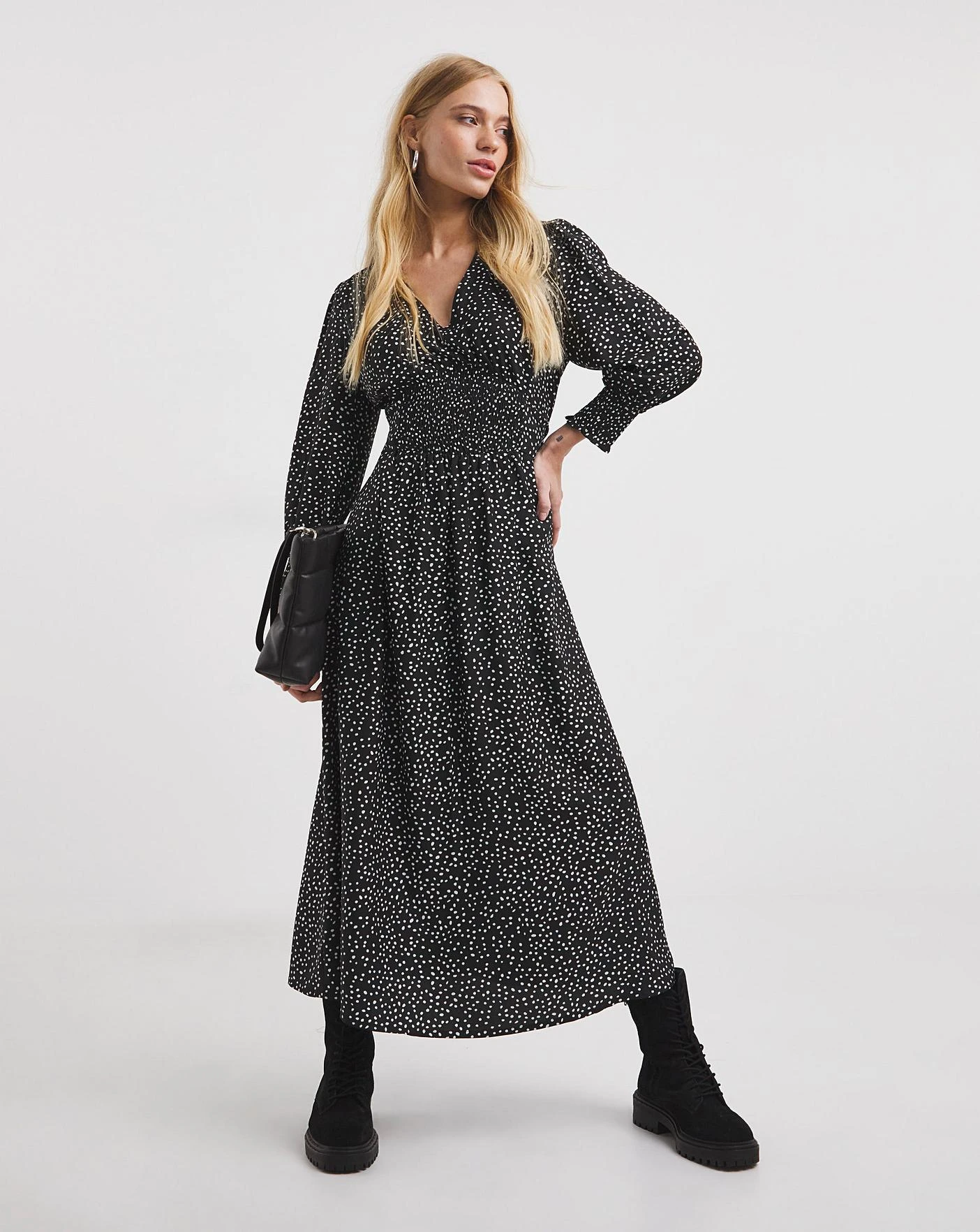 Dress to impress this season in our gorgeous waisted dress. Featuring a front shirred panel, ¾ sleeves with deep shirred cuffs, and a tie waist to be tied either at the front or the back. This dress falls at our midi length. Dress up or down for any occasion.