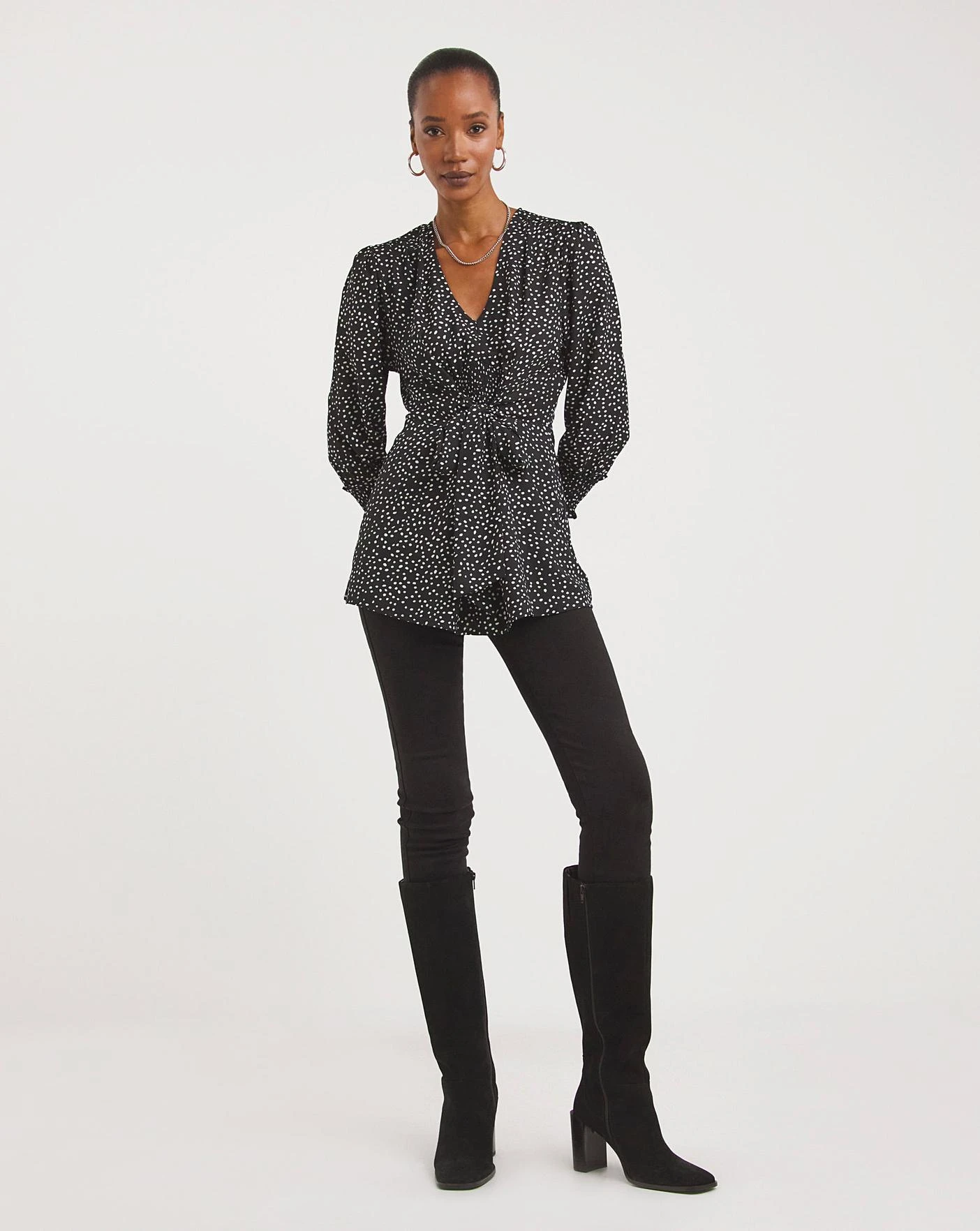 Our tie front v neck blouse is a great daytime piece, which can be paired easily with casual trousers or leather pants. This blouse is made of a non-stretch viscose and comes in a relaxed fit.