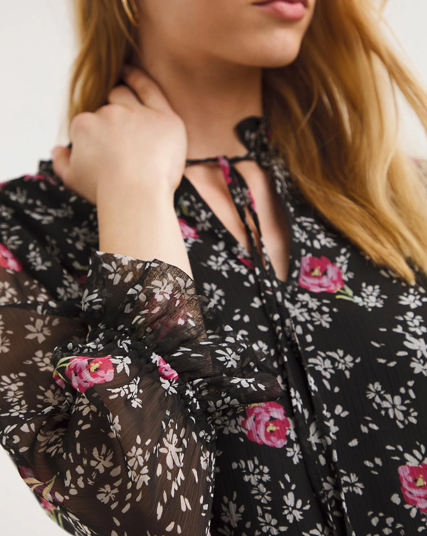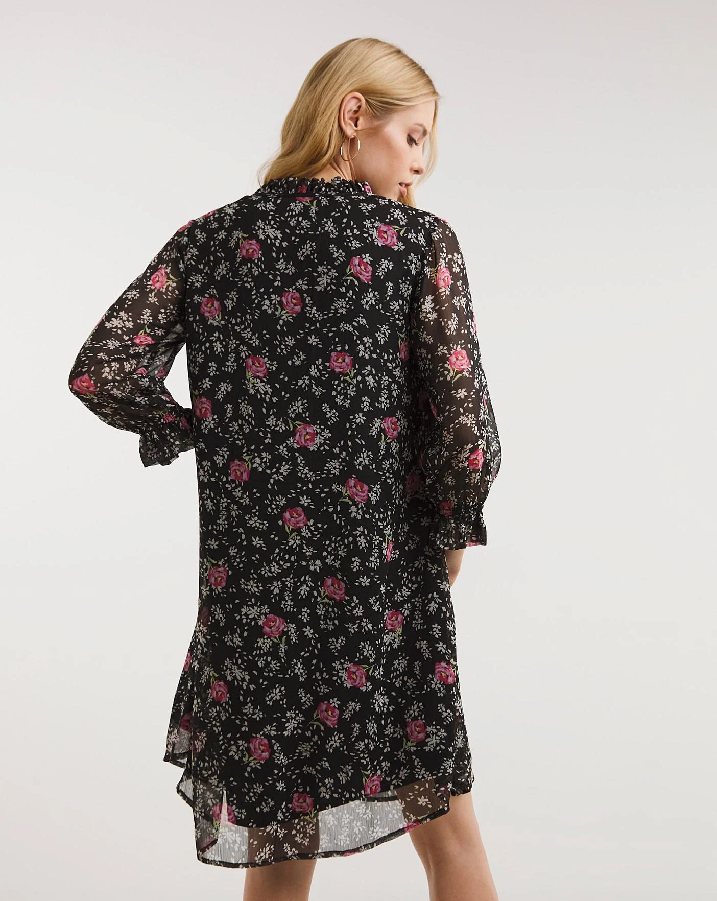 Our best-selling shape re-designed in a fresh floral print. In an effortless swing shape, this dress falls to a flattering knee length. Featuring 3/4 sleeves with an elasticated cuffs, a matching ruffle neck with a functional tie, and shirred panel detailing on the shoulder.
