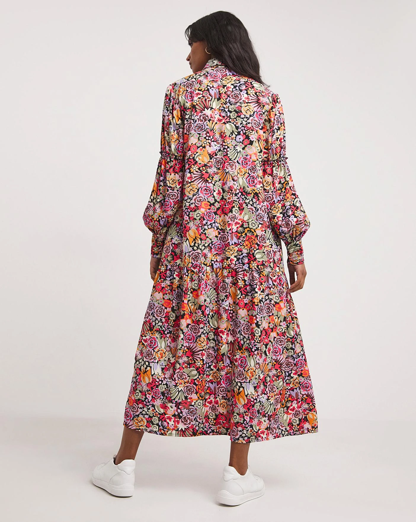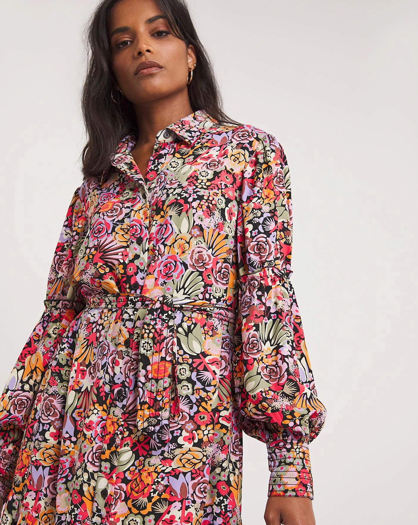 Designed in a beautiful all over floral print, this shirt dress is perfect for any occasion day or night. Featuring balloon cuffed sleeves to add simplistic sophistication and a detachable/functional tie waist band to add a flattering shape.