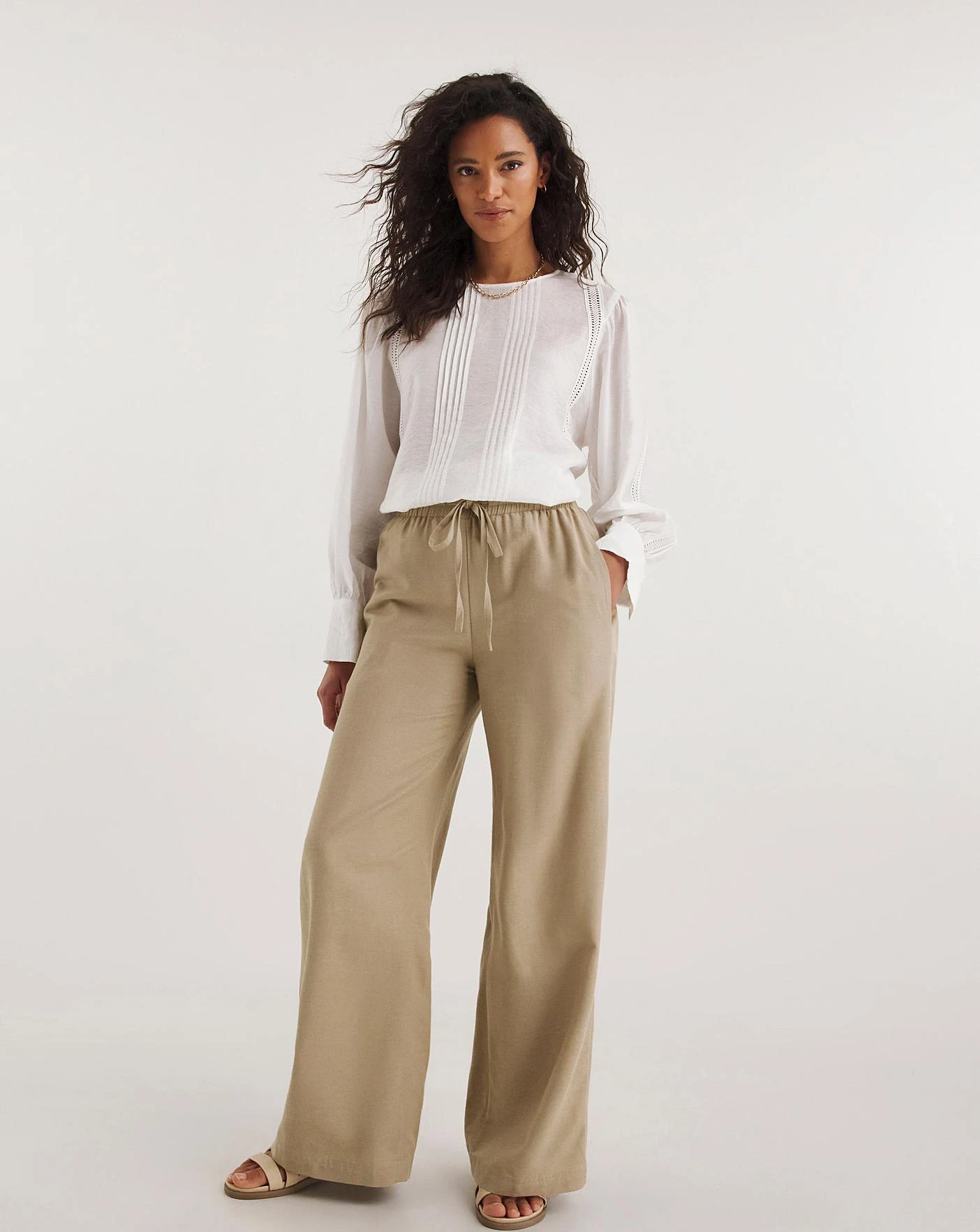 Our shape for this season, the linen blend wide legs are a true wardrobe essential. In a huge range of colours, these trousers feature a comfortable pull on elasticated waistband, a flattering wide leg and side pockets for convenience. Super easy to wear and to pair with any footwear and perfect for your summer holidays.