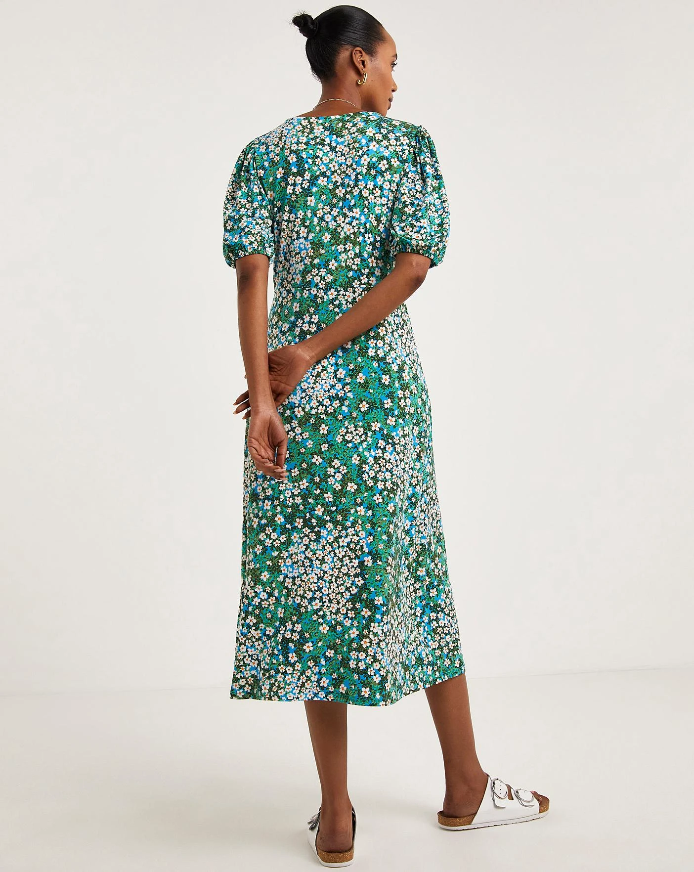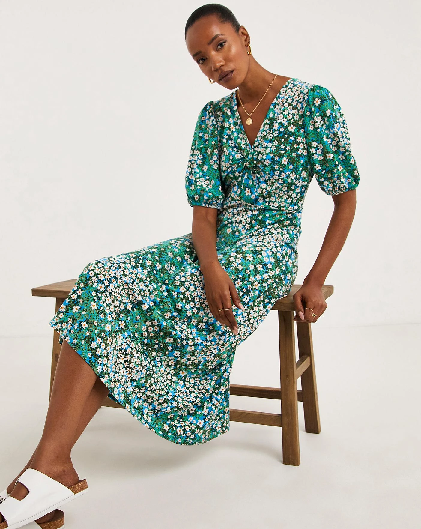 This pretty dress features a twist front detail and short voluminous sleeves. In a midi length, this dress is perfect for the summer season.