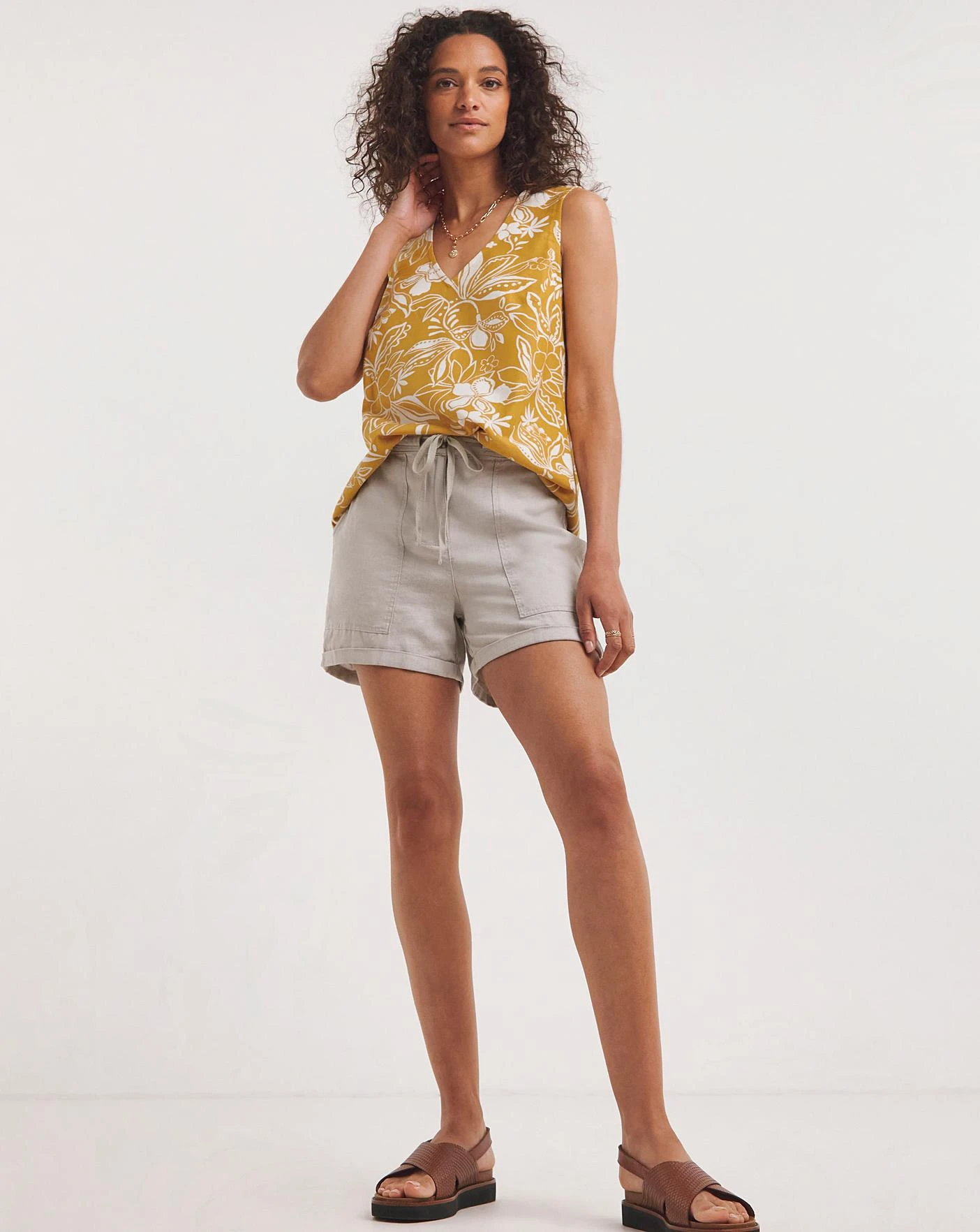 Our v neck linen vest is a great day time piece that can be worn easily with shorts or relaxed trousers. Please note that this top is made of a non-stretch fabric and comes in a relaxed fit.