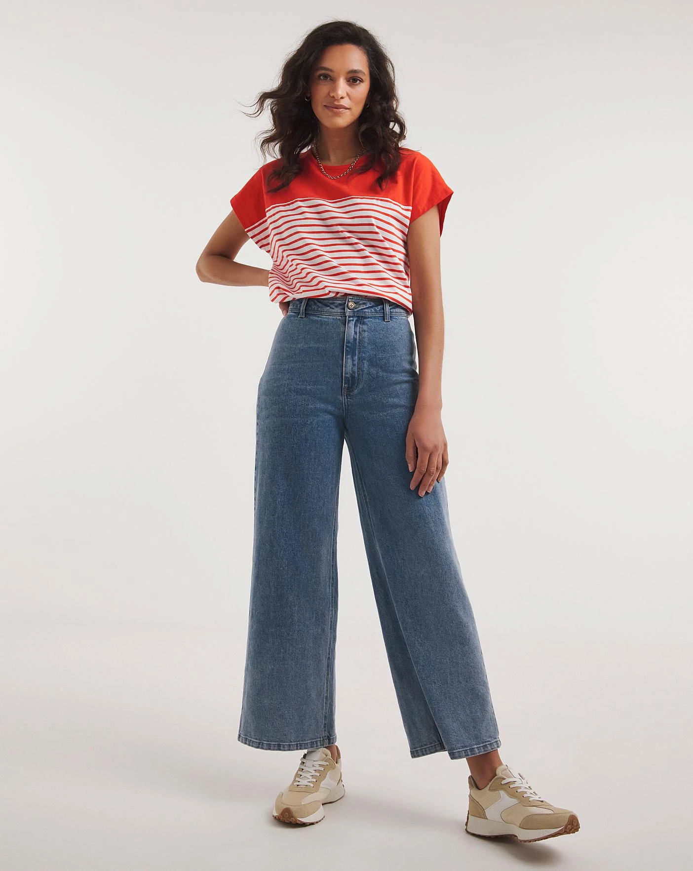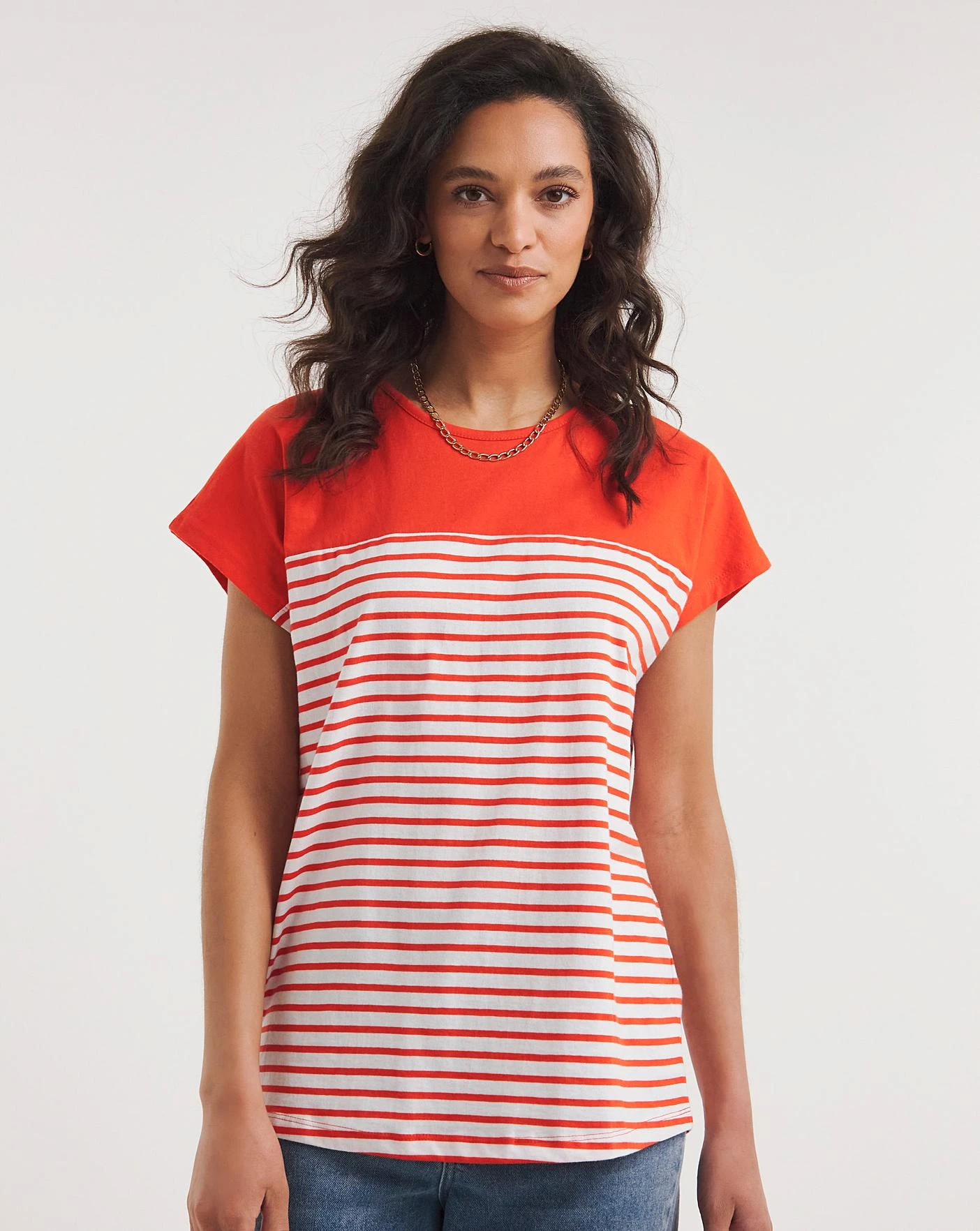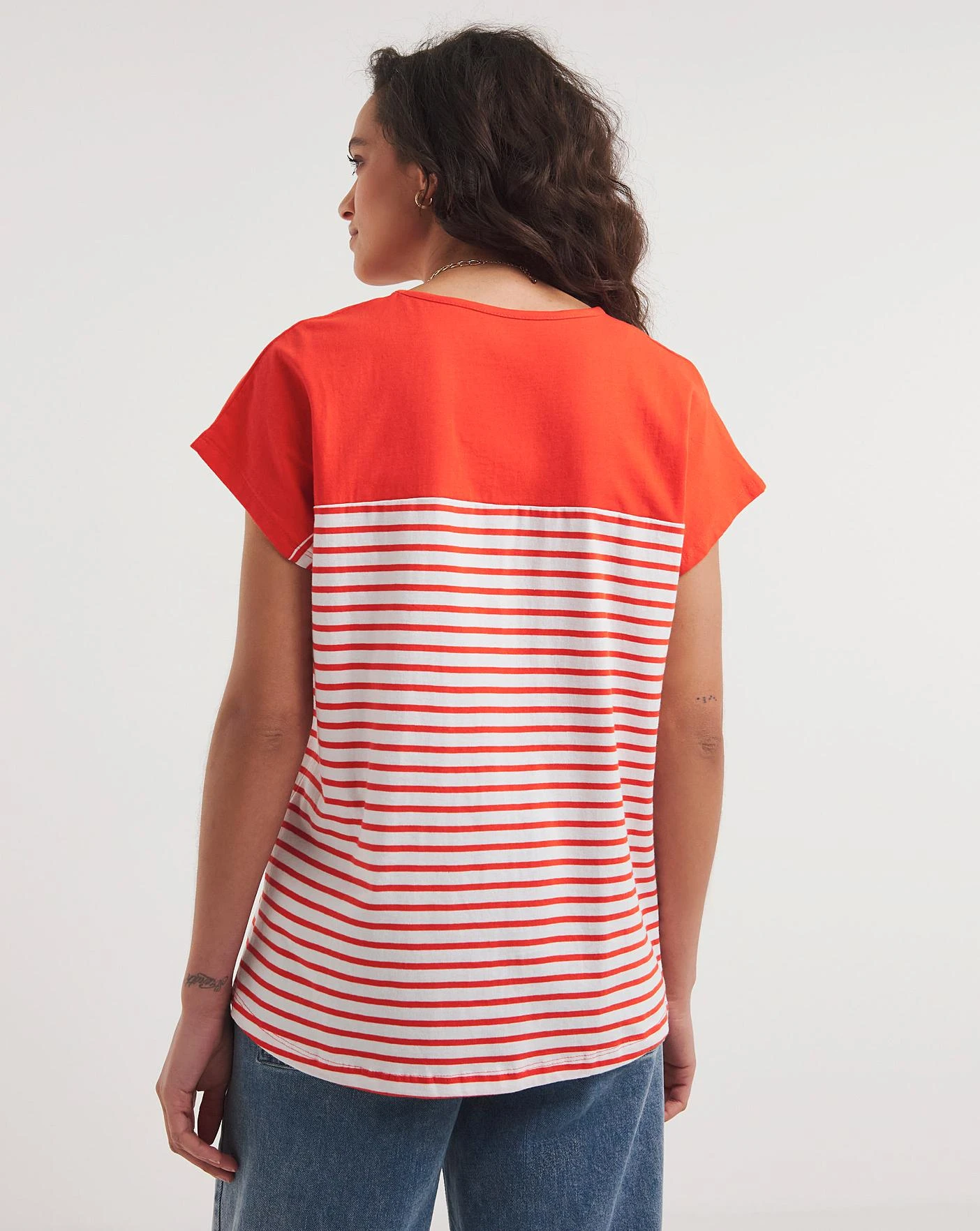Add something new to your wardrobe with our colour block tops. Featuring short grown on sleeves and a round neckline. The yoke of the top comes in a solid colour.
