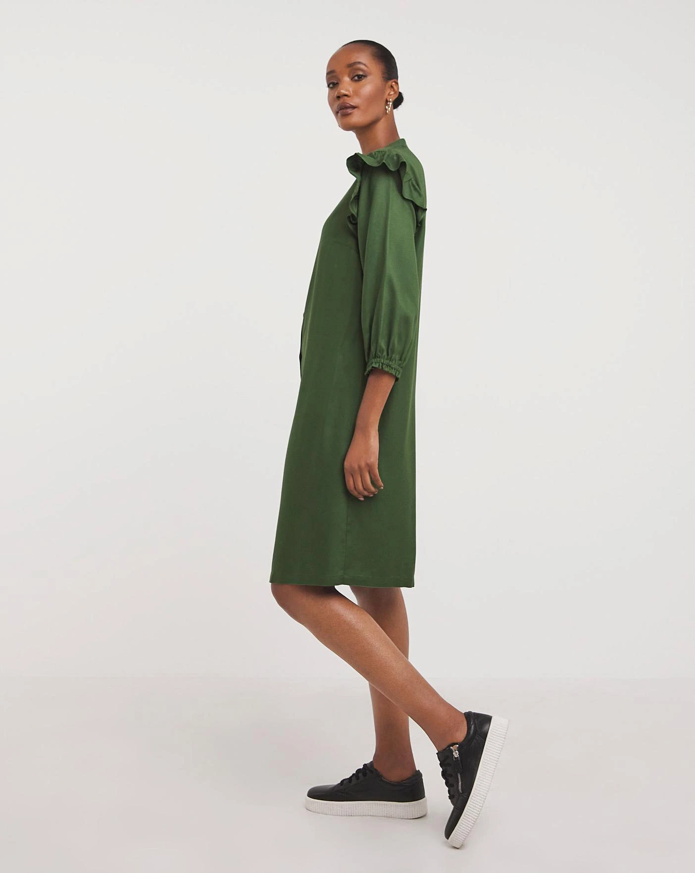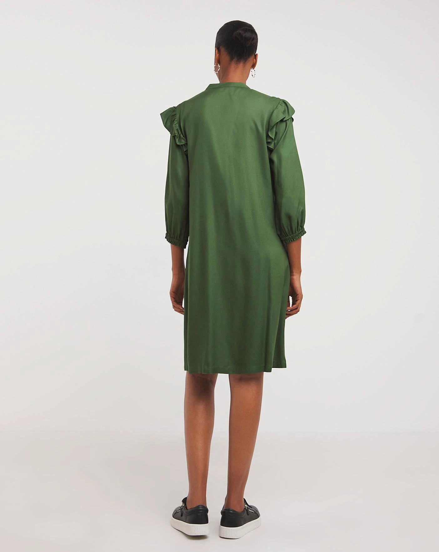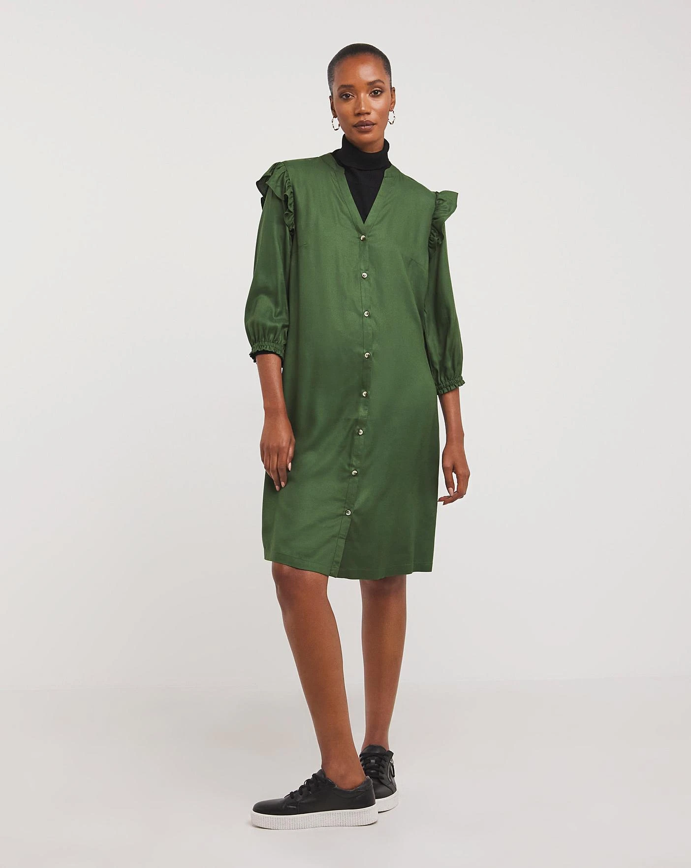 Cut from a Viscose Twill fabrication this button through shirt dress is both relaxed and smart. This easy throw-on dress has been designed with an open neck, three quarter length sleeves, feminine shoulder ruffles and side seam pockets. Perfect for everyday styling.