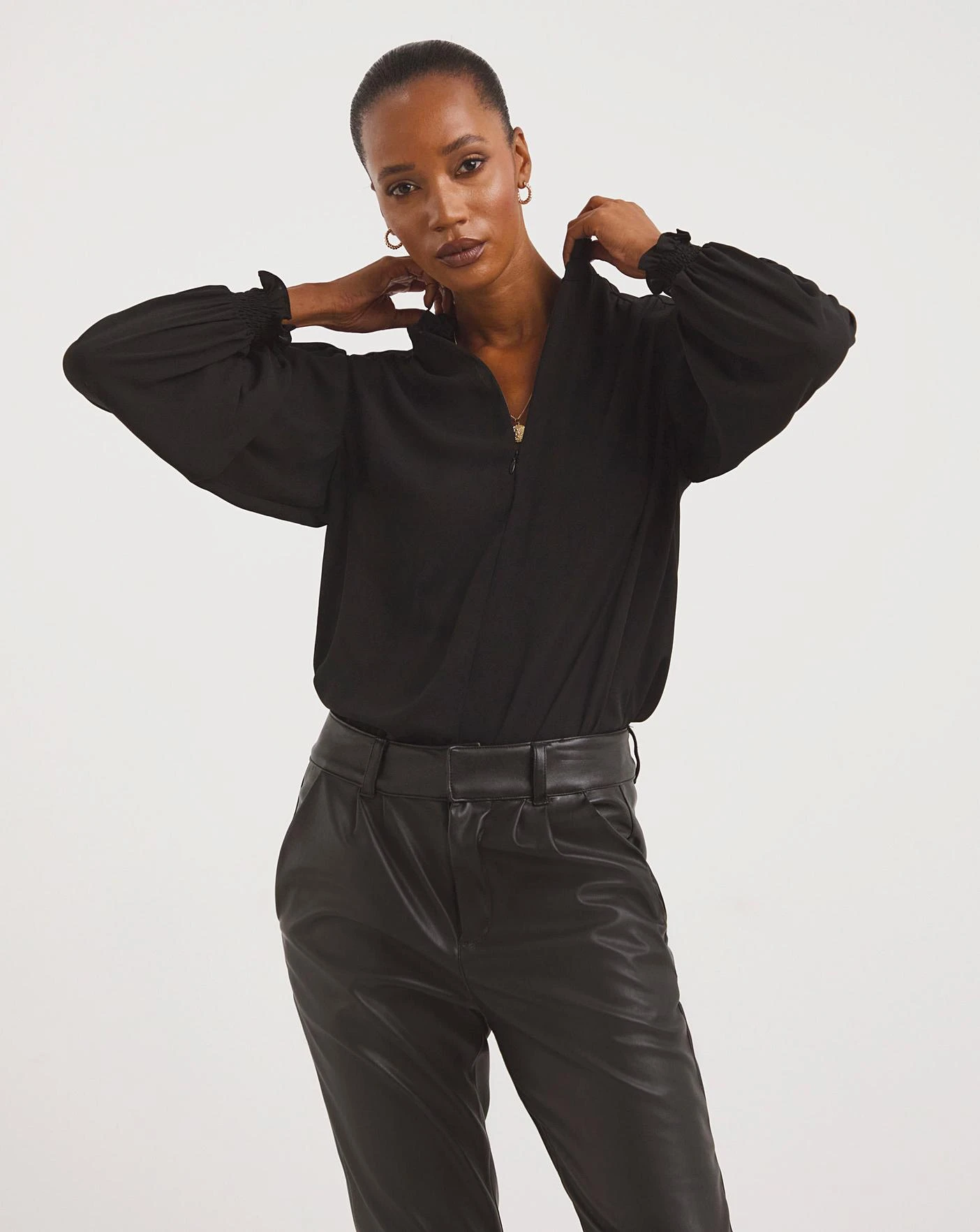 For a great seasonal daytime look, choose our volume sleeve zip front blouse. The zip detail adds great versatility as the top can be styled zipped up, or more casually un-zipped as shown on the photography. Wear this top tucked into casual jeans, with the ability to take this look from the day into the night. Please note that this blouse is made of a non-stretch polyester and comes in a relaxed fit.